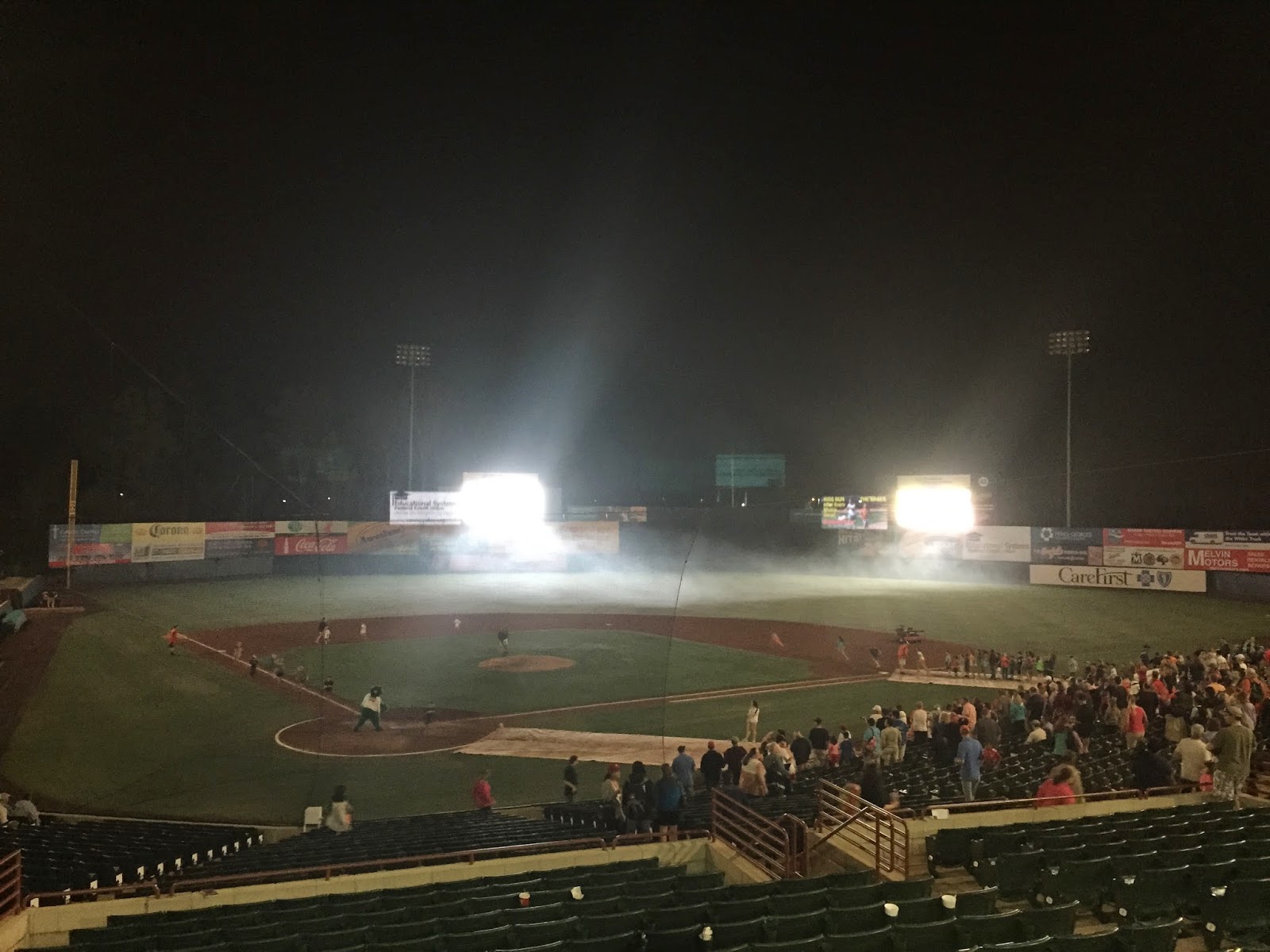 Bowie, MD, home of the AA affiliate of the Baltimore Orioles. It’s actually a perfect combination, since Old Bay is manufactured in Baltimore. They play their home games at Prince George’s Stadium, located of course in Prince George’s county. PG county was formed in 1696 and named for Prince George of Denmark, husband of Anne, Queen of Great Britain, and the brother of King Christian V of Denmark and Norway. The stadium itself isn’t much to speak of, but even in 1994 when it was opened, they thought to have open concourses so you can see the game while waiting in line for your Old Bay sausage! Capacity is about 10,000. Like most minor league games I’ve gone to, the fans were great! Even made friends with the folks around me who seemed to be long time Baysox fans. Of course the kids got to run the bases after the game, which was a neat effect in the billowing smoke leftover from the evening fireworks!Star Spangled Banner and baseball