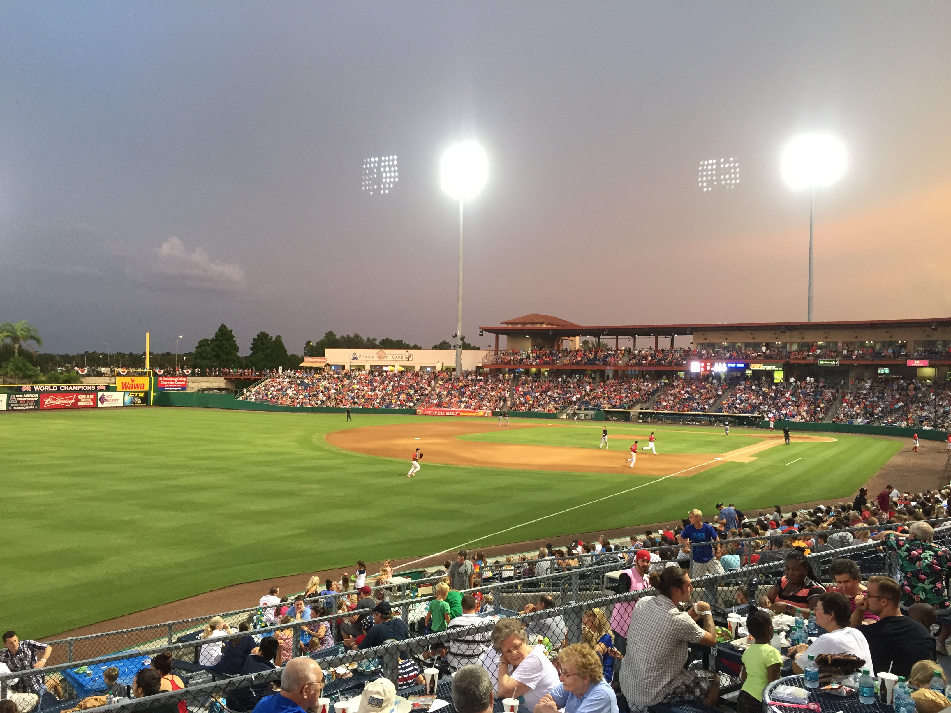 On Friday, July 3rd, had the chance to see the Clearwater Threshers, the Phillies Class A affiliate in the Florida State League, take on the evil empire Yankees from Tampa. I had been to Bright House Field for a spring training game this spring, and looked forward to the trip back. What a wonderful stadium. I can see why it’s consistently ranked as one of the best places to watch a baseball game. For this evening’s contest, we actually sat out on the berm which runs the entire length of the outfield fence. Lots of friendly fans and families enjoying a wonderful night at the ballpark.Photo Jul 03, 8 17 36 PM083
